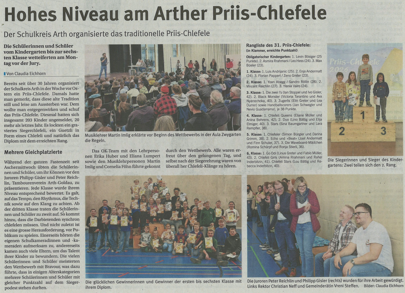 Beim diesjährigen Chlefeli-Wettbewerb nahmen erneut über 200 Kinder aus dem Schulkreis Arth teil, was mehr als die Hälfte aller Schülerinnen und Schüler ist. Die Jury bewertete ruhig und abgeklärt und kürte die Siegerinnen und Sieger. Traditionsgemäss gaben diese bei der Rangverkündigung ihr Siegesstück nochmals zum Besten, zur Freude des ganzen Schulkreises und den zahlreichen anwesenden Eltern.