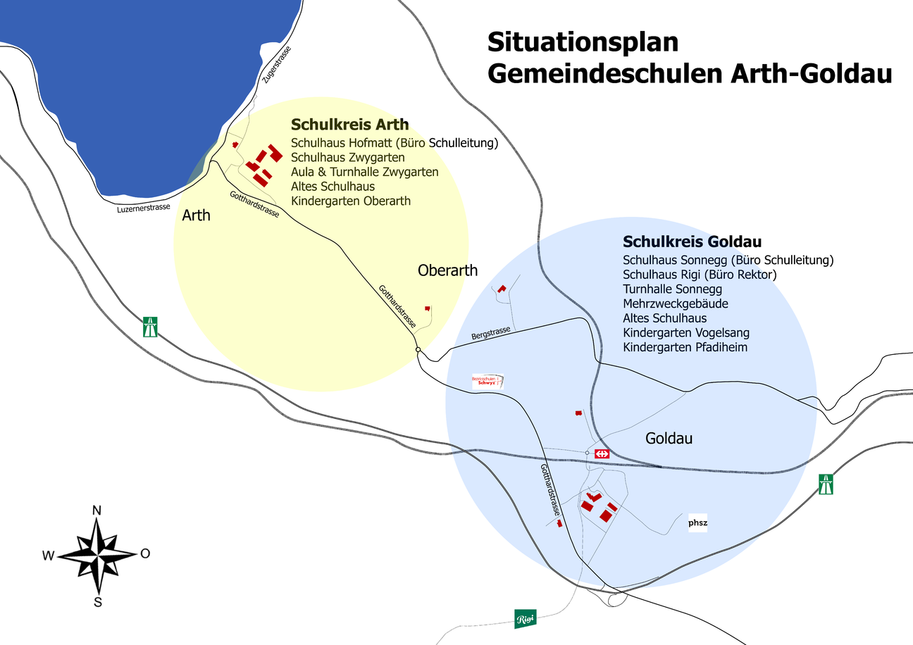 Die Gemeindeschulen Arth-Goldau, bestehend aus dem Schulkreis Arth und Schulkreis Goldau, haben verschiedene Schulhäuser in Arth, Oberarth und Goldau. Auf dem Lageplan sehen Sie den Standort der entsprechenden Gebäude. Detailliertere Informationen zu den einzelnen Schulhäusern finden Sie unter Schulkreis Arth oder Schulkreis Goldau.